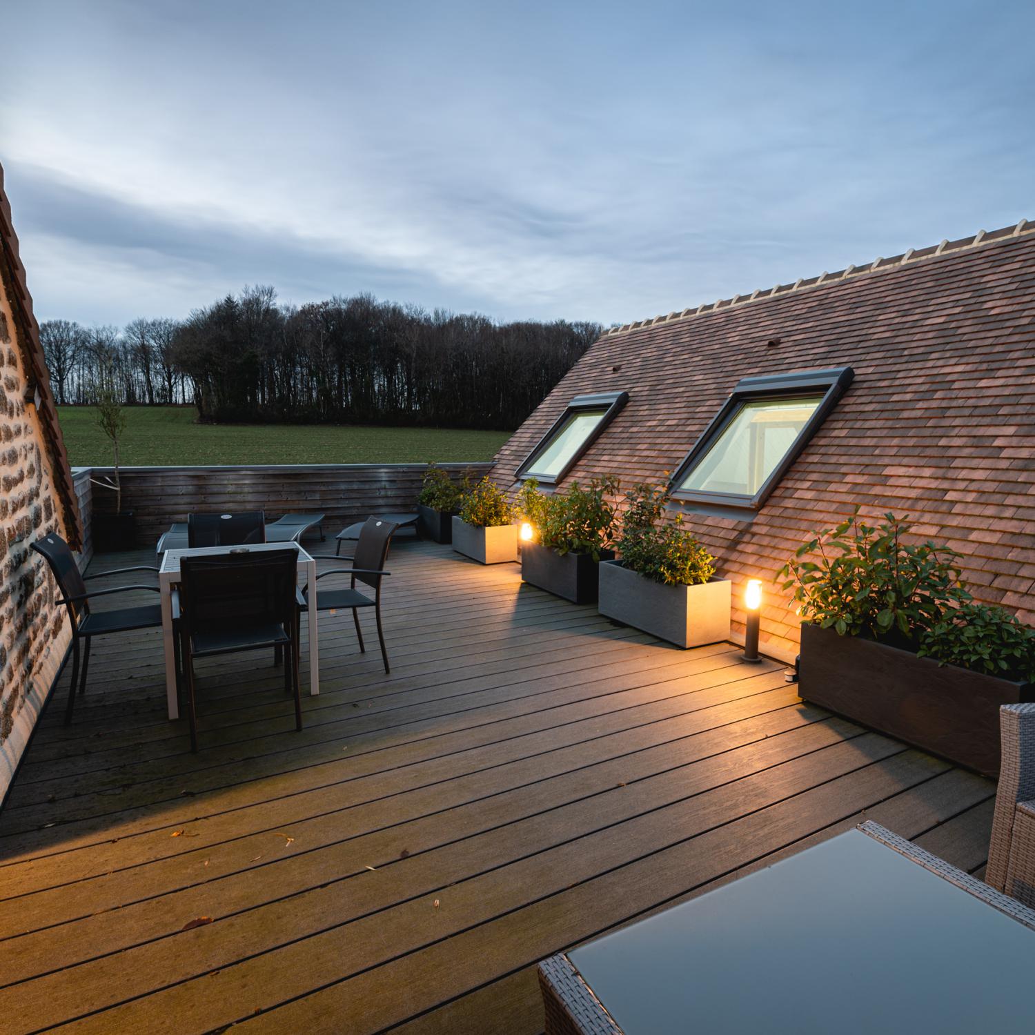 Une terrasse extérieur de 40m² privative, accès uniquement par à la chambre, avec transats, salon de jardin, table et chaise